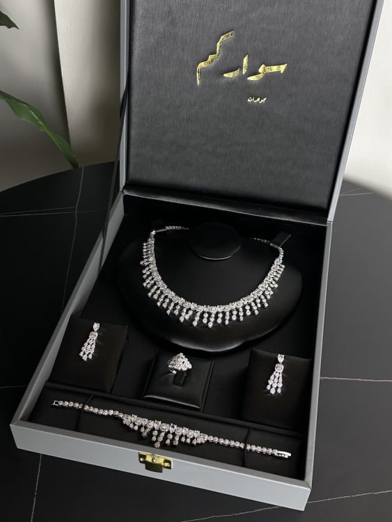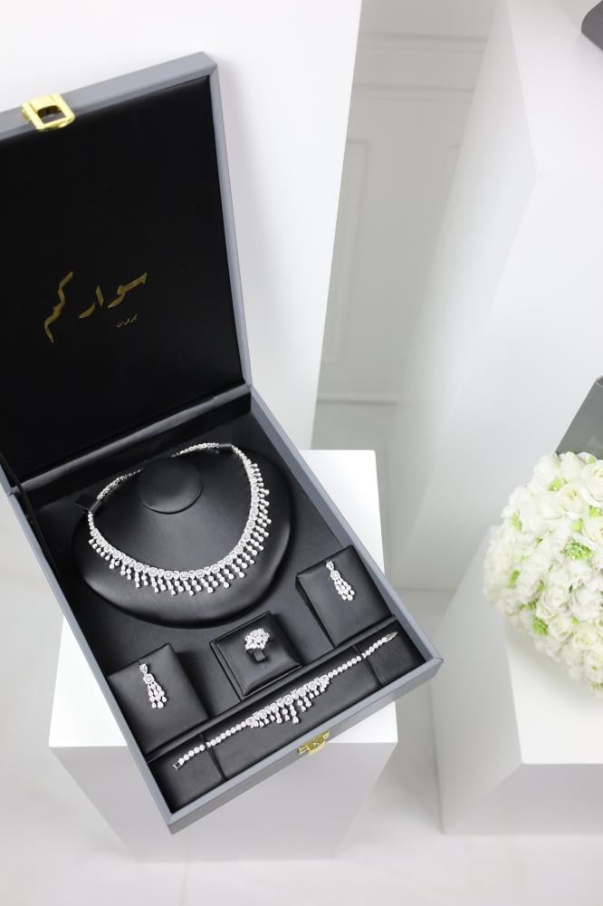 • يأتي طقم مجوهرات زركون متكون من ( قلادة + أقراط+ اسوارة + خاتم)